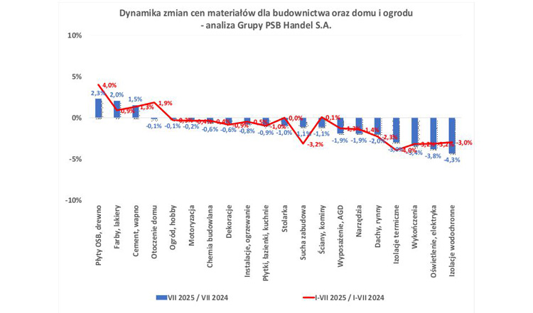 Wzrost cen w lipcu 2025 r. w porównaniu do lipca 2024 r. odnotowano w 3 grupach towarowych, które dotyczyły kategorii: płyty OSB, drewno, farby, lakiery oraz cement, wapno (po +2%). Na tym samym poziomie pozostały ceny w kategoriach: otoczenie domu, ogród, hobby oraz motoryzacja. Spadek cen wystąpił w 14 podgrupach, z czego o 1% spadły ceny w kategoriach: chemia budowlana, dekoracje, instalacje, ogrzewanie, płytki, łazienki, kuchnie, stolarka, sucha zabudowa oraz ściany, kominy. Dalej w kolejności uplasowały się grupy: wyposażenie, AGD, narzędzia i dachy, rynny (po -2%), izolacje termiczne i wykończenia (po -3%). A największy spadek cen wystąpił w kategoriach: oświetlenie, elektryka i izolacje wodochronne (po -4%).