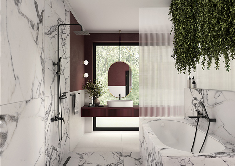 Przestronna łazienka zgodnie z aktualnymi trendami to nie tylko pomieszczenie służące określonym funkcjom, ale także prywatny salon kąpielowy. Na dużej powierzchni możliwe jest połączenie zarówno wanny, jak i kabiny prysznicowej, dzięki czemu użytkownicy mają wybór pomiędzy szybkim, energetyzującym prysznicem a długą, relaksującą kąpielą. Oba rozwiązania mogą istnieć obok siebie, nie konkurując o przestrzeń, a wręcz ją wzbogacając. Taki układ świetnie oddaje elegancka aranżacja z jagodowym akcentem kolorystycznym, którą uzupełniono armaturą z kolekcji Vitto Black VerdeLine. Efekt przestronności potęguje duże okno, za którym rozciąga się widok na ogród.