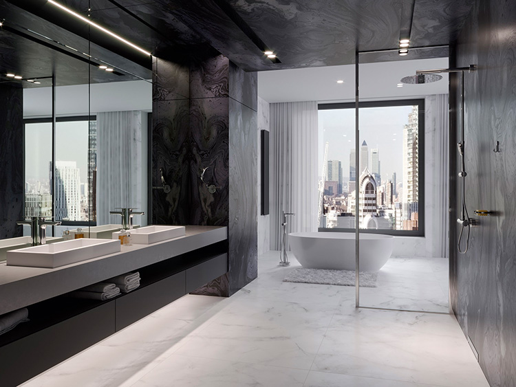 Duża łazienka to także szansa na zaprojektowanie rozbudowanej strefy umywalkowej. Dwie misy obok siebie ułatwiają codzienne funkcjonowanie, szczególnie w domach, gdzie w porannych i wieczornych rytuałach uczestniczy więcej domowników. W połączeniu z odpowiednio dobranym oświetleniem, dużym lustrem i szafkami do przechowywania kosmetyków czy ręczników, przestrzeń ta staje się nie tylko praktyczna, ale również elegancka i wyjątkowo reprezentacyjna. W luksusowej aranżacji przypominającej hotelowy apartament w strefie umywalkowej postawiono na baterie nablatowe Algeo Square. Idealnie pasują one do wyrazistych linii umywalek.