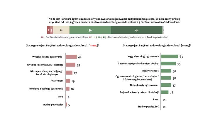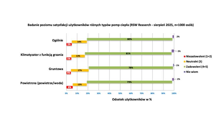 Jak wynika z badania zrealizowanego przez SW Research w sierpniu 2025 r., aż 80% użytkowników pomp ciepła w Polsce jest zadowolonych z tego sposobu ogrzewania, podczas gdy tylko 5% deklaruje niezadowolenie. Wykonano je na reprezentatywnej próbie 1000 właścicieli budynków jednorodzinnych ogrzewanych pompami ciepła i jest to pierwsze w Polsce tak szerokie badanie tej grupy osób. Również inne krajowe badania potwierdzają wysoki poziom zadowolenia użytkowników pomp ciepła, wskazując dodatkowo, że jest on wyższy niż wśród osób korzystających z pozostałych technologii grzewczych. Tak samo jest w wielu krajach europejskich.