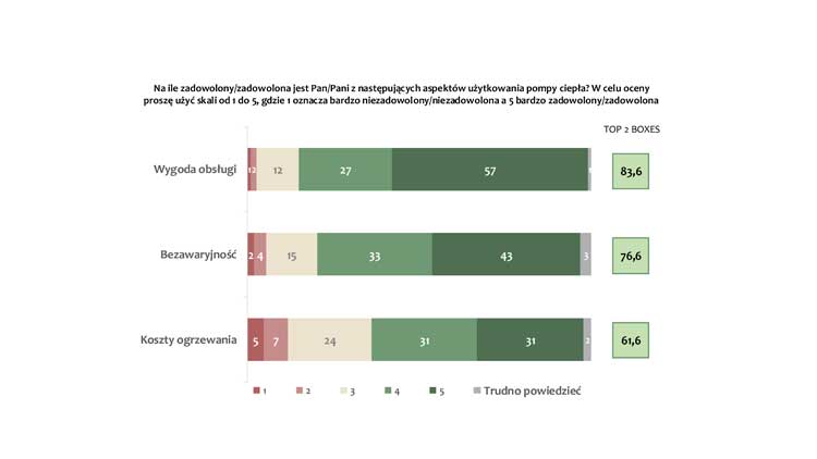 W Wielkiej Brytanii 94% użytkowników pomp ciepła jest zadowolonych (w tym 50% „bardzo zadowolonych”) z zastosowania tej technologii w swoim domu. W przypadku posiadaczy kotłów gazowych poziom zadowolenia jest niższy i wynosi 85%. Z kolei we Francji i w Niemczech satysfakcję z pomp ciepła deklaruje 91% użytkowników tych urządzeń, a z kotłów gazowych − 81% ich właścicieli. Zestawienie pomp ciepła z kotłami gazowymi jest celowe, ponieważ właśnie te dwie technologie zapewniają pełną bezobsługowość. Ponadto w analizowanych krajach kotły gazowe od lat mają bardzo silną pozycję na rynku grzewczym.