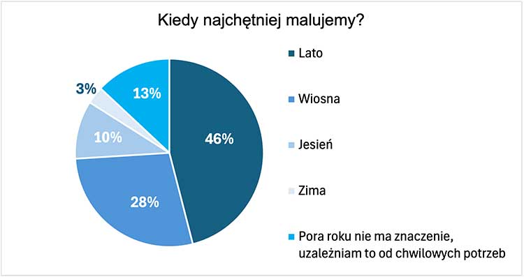 Najpopularniejszą porą roku na prace remontowe jest lato, które wybiera 46% badanych. Wiosna również cieszy się popularnością (28%), podczas gdy jesień (10%) i zima (3%) są brane pod uwagę znacznie rzadziej.