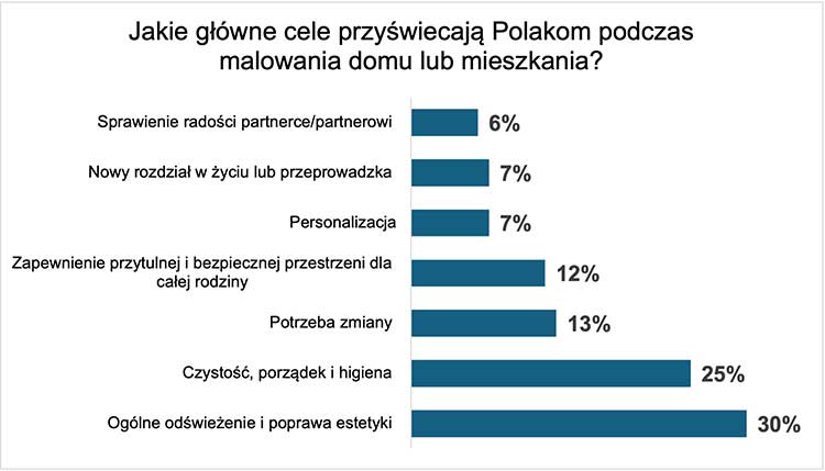 Dlaczego Polacy decydują się na malowanie? Najczęstszym powodem są brudne lub uszkodzone ściany, na które wskazuje aż 85% badanych. Niewiele mniej osób (84%) podejmuje się malowania po remoncie, zalaniu lub innych zniszczeniach, a 72% decyduje się na to przy okazji przeprowadzki do nowego miejsca. Głównym celem tych prac jest ogólne odświeżenie i poprawa estetyki wnętrza (30%), a także dbałość o czystość i porządek (25%). Nieco rzadziej motywacją staje się potrzeba zmiany (13%), czy zapewnienie przytulnej i bezpiecznej przestrzeni dla całej rodziny (12%).