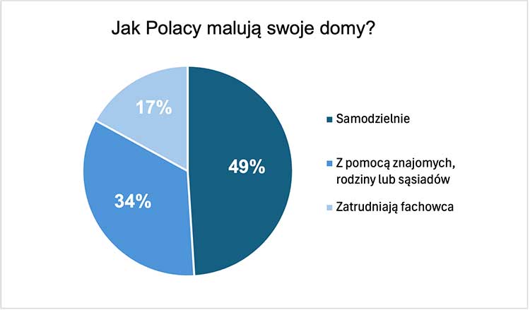 Większość Polaków decyduje się na samodzielne malowanie - aż 49% respondentów wykonuje te prace we własnym zakresie. Kolejne 34% korzysta z pomocy znajomych lub rodziny, a na skorzystanie z usług fachowców decyduje się 17%. Decyzja o malowaniu samodzielnie lub z udziałem fachowca najczęściej zależy od budżetu (57%), dostępności czasu (47%) oraz od wielkości powierzchni do pomalowania (46%) i stopnia trudności (46%).