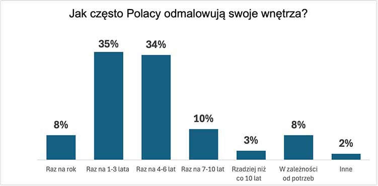 Malowanie wnętrz stało się dla wielu Polaków stałym elementem dbania o otaczającą przestrzeń. Najwięcej osób wskazuje, że odświeża swoje mieszkanie co 1-3 lata (35%), a niemal tyle samo robi to co 4-6 lat (34%). Tylko 3% maluje rzadziej niż raz na dekadę, co świadczy o dużej trosce o estetykę wnętrz.