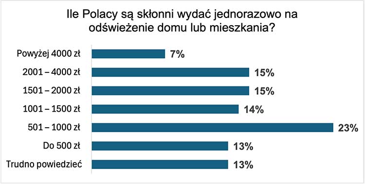 Koszty malowania to ważny aspekt decyzji remontowych Polaków. Najwięcej osób (23%) deklaruje, że na odświeżenie mieszkania lub domu jest w stanie wydać jednorazowo od 500 do 1 tys. zł. Budżet w przedziale 1,5 – 2 tys. zł oraz 2 – 4 tys. zł wskazało po 15% badanych, a 14% mogłoby przeznaczyć kwotę w przedziale 1-1,5 tys. zł. Z kolei 13% respondentów ograniczyłoby wydatki do 500 zł, zaś 7% zadeklarowało gotowość przeznaczenia na ten cel ponad 4 tys. zł.