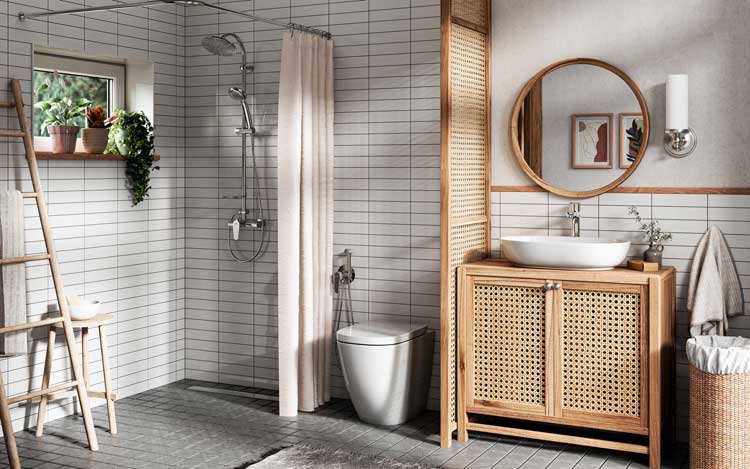 Ten styl łączy oryginalność bohemy, hippisowski luz i rękodzieło. Wykorzystuje się w nim materiały naturalne, jak drewno, bawełna i wiklina, a także kolory ziemi i biel, etniczne wzory oraz rośliny. Sedes z funkcją bidetu w łazience w tym stylu to wybór oczywisty. Łączy kilka funkcji, wpisując się w trend swobodnych wyborów na co dzień. To możliwe, dzięki praktycznemu duetowi, który tworzą sedes (dowolny model) oraz bateria podtynkowa bidetowa z zestawem ALGEO. Jeśli sedes umieści się blisko umywalki, tak aby rączka baterii, zamocowana na wężu, sięgała do niej, można np. wygodnie umyć włosy. Rączka bidetowa sprawdzi się też m.in. do napełnienia miski z tkaninami do farbowania czy kąpieli psa.