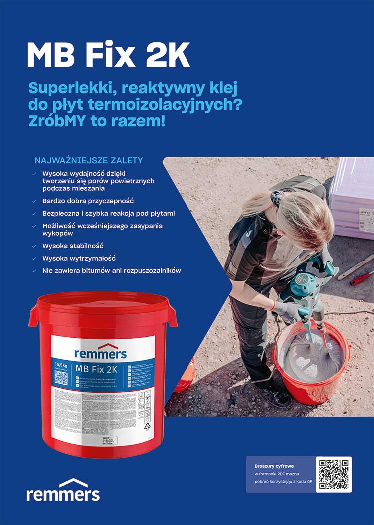 W erę postbitumiczną weszły teraz również produkty do klejenia płyt termoizolacyjnych. Nowy produkt w ofercie firmy Remmers, MB Fix 2K opiera się – podobnie jak wszystkie inne produkty z rodziny MB – na reaktywnym i szybko wiążącym, niezawierającym bitumu spoiwie.