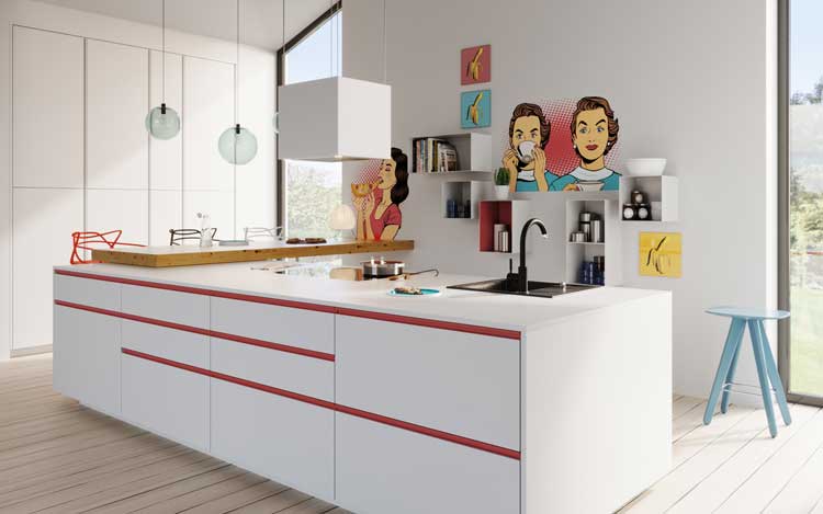 Minimalizm nabiera niepowtarzalnego charakteru dzięki odważnym kolorom i inspiracjom sztuką pop-art. Gładkie, białe fronty wyspy z poziomymi, czerwonymi uchwytami nadają zabudowie energię i dynamikę. Strefa zmywania utrzymana w ciemnych barwach kryje grafitowy zlewozmywak MEZZO II i czarną matową baterię LUGIO BLACK. Niebieski stołek i oryginalne hokery wprowadzają luźny, artystyczny akcent, a drewniany, podwyższony blat łagodzi kontrasty i ociepla kompozycję.