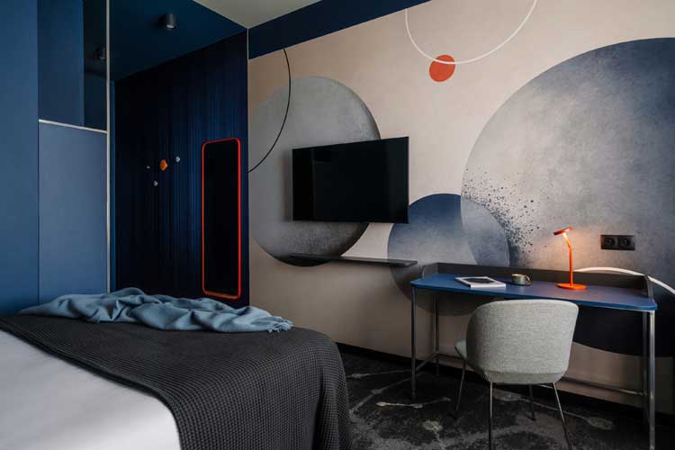 Wszystkie te elementy współtworzą wyrazisty styl obiektu, który działa na zmysły i na długo zapada w pamięć. – Do hotelu zaprojektowaliśmy również szereg unikalnych elementów wyposażenia, które składają się na jego tożsamość. Wśród nich znajdują się pufy według autorskiego projektu, meble z indywidualnie dobranymi tapicerkami idealnie wpisującymi się w gwiezdny charakter wnętrza oraz karbowane lustro, które mieni się różnymi kolorami w zależności od pory dnia niczym planeta widziana z kosmosu. Na uwagę zasługują także spersonalizowane oznakowania drzwi oraz meble stałe i zabudowy wykonane przez stolarzy według projektu architektów, z detalami precyzyjnie dopasowanymi do całości estetyki – mówi arch. Karolina Kowalik, współwłaścicielka AKA Studio.