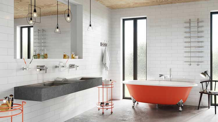 Białe płytki odbijają promienie wpadające przez wysokie przeszklenia, rozjaśniając otoczenie. Na ich tle wyróżnia się masywny, grafitowy blat ze wpuszczonymi umywalkami i wanna w energetycznym pomarańczu, wsparta na dekoracyjnych lwich łapach. Surowe elementy, jak betonowa posadzka, żarówki edisonki i druciane oprawy, nadają całości lekko loftowy klimat. Zastosowane baterie podtynkowe ALGEO marki FERRO o geometrycznych formach i chromowanym wykończeniu zachwycają prostotą. Mechanizmy ukryto w ścianie, dzięki czemu widoczne pozostają płaskie maskownice, wylewki i uchwyty. Wbudowane perlatory napowietrzają strumień, co pozwala ograniczyć zużycie wody.