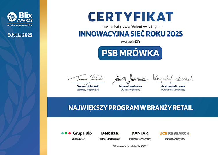 Sieć PSB Mrówka została uhonorowana nagrodą "BLIX AWARDS 2025" - Wybór Konsumentów 2025, zdobywając tytuł „Innowacyjna Sieć Roku 2025” w kategorii DIY. To prestiżowe wyróżnienie, przyznawane w ramach największego programu branży retailowej w Polsce, ma szczególne znaczenie, ponieważ opiera się na wynikach badań ilościowych przeprowadzonych łącznie wśród 145 tys. polskich konsumentów odpowiedzialnych za codzienne zakupy - zarówno w sklepach stacjonarnych, jak i sklepach internetowych.