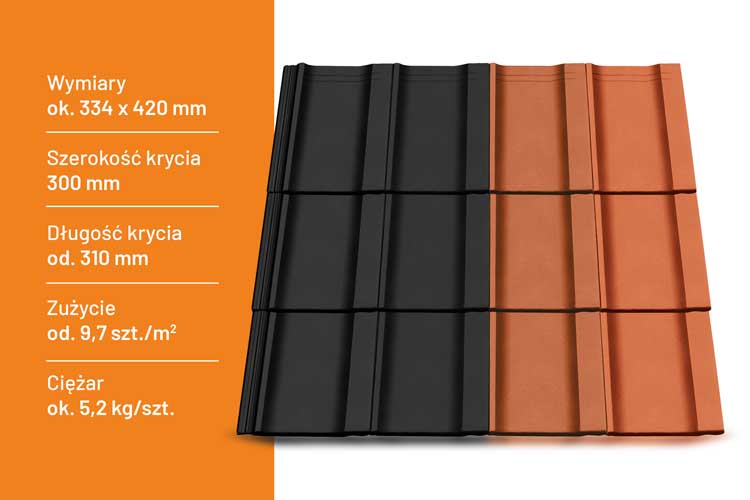 Optymalizacja formatu obniża koszty materiałowe i skraca czas realizacji inwestycji. Format 334 x 420 mm, sprawia że na metr kwadratowy mamy zużycie od 9,7 sztuk dachówek. To efektywne pokrycie dużych powierzchni. Dachówka KIOTO to nie tylko podstawowy element – to pełen komplet wraz z akcesoriami cementowymi: dachówki funkcyjne, połówkowe, elementy wentylacyjne, gąsiory z kompletną gamą dodatków. System przemyślany od początku do końca.