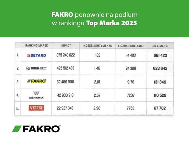 FAKRO umacnia swój wizerunek marki nowoczesnej, odpowiedzialnej i bliskiej klientowi. Wyróżnienie w rankingu „TOP Marka 2025” jest nie tylko dowodem wysokiej jakości produktów, lecz także potwierdzeniem skutecznej strategii komunikacji, dzięki której marka utrzymuje silną pozycję w świadomości konsumentów oraz partnerów biznesowych.