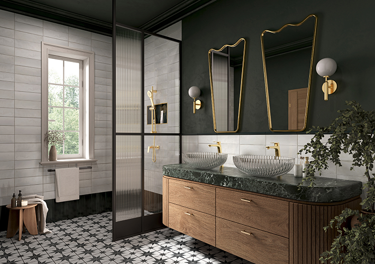 Szafka z dwoma stanowiskami przyciąga uwagę rzeźbiarskimi misami ze szkła o pionowych żłobieniach, umieszczonymi na masywnym blacie z ciemnego kamienia o ciemnozielonym zabarwieniu. Złote, połyskujące baterie VITTO GOLD VERDELINE rozświetlają otoczenie. Ich ceramiczne regulatory gwarantują płynną i trwałą pracę. Widoczne słoje frontów pojemnych szuflad, zaokrąglone rogi i kinkiety z mlecznymi kloszami tworzą efekt przyjemnej miękkości. Nieregularne lustra w metalowych ramach i posadzka z geometrycznym wzorem ożywiają przestrzeń, dodając dynamiki. Prysznic walk-in został odgrodzony lekkim przeszkleniem z czarną ramą, co zapewnia intymność bez utraty przejrzystości. Ścienna bateria natryskowa z tej samej kolekcji zestawiona została z przesuwnym zestawem z okrągłą rączką RILLO. Ustawiony obok niski stołek na drobiazgi wprowadza swobodny akcent, a roślinność dopełnia kompozycję.