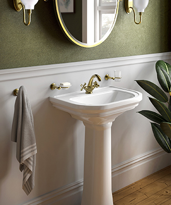 Ciepły parkiet i sztukateria odwołują się do historycznego ducha kamienicy. Klasyczna, biała ceramika na smukłym piedestale sprawia, że strefa umywalkowa prezentuje się lekko i elegancko. Okrągłe zwierciadło i symetryczne kinkiety nadają jej subtelny blask. Oliwkowe ściany z boazerią zakończoną dekoracyjną listwą tworzą wysmakowane tło dla armatury ANTICA utrzymanej w tonacji starego brązu. Charakterystyczna rączka natryskowa przypominająca słuchawkę telefoniczną i krzyżowe uchwyty podkreślają styl pomieszczenia. Dopracowane detale dodają wyrafinowania. Naturalne światło wpadające przez okno z tradycyjnymi szprosami wydobywa szlachetność zastosowanych materiałów i uwydatnia liczne dekoracyjne profilowania.