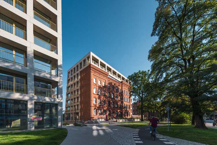 Głównym celem pracowni było zaprojektowanie przestrzeni, która z jednej strony zapewni wysoki komfort mieszkania, a z drugiej – połączy ze sobą dwa przeciwstawne światy – miejską linię zabudowy i rzekę Odrę wraz z jej zielonymi wyspami. Nowe apartamentowce pod względem kubatury nawiązują do swoich bezpośrednich sąsiadów – nowoczesnego hotelu z jednej i XIX wiecznego budynku aresztu z drugiej strony. Od strony ulicy Drobnera apartamentowce domykają miejską zabudowę. Natomiast wychodzące na Odrę pochyłe ściany sprawiają, że budynki wydają się „zapierać” o jej brzeg. Wyzwaniem pod względem projektowym był także ceglany budynek szkoły. Finalnie połowa starego budynku została odtworzona i włączona w nową, betonową strukturę. Jego historyczny charakter jest widoczny także od wewnątrz – w układzie pomieszczeń, materiałach wykończeniowych i różnicach poziomów na łączeniu dwóch części. Kompleks złożony z dwóch apartamentowców różniących się kubaturą i częściowo zastosowanymi materiałami wymagał wspólnego mianownika, którym okazały się prefabrykaty z wysokiej jakości betonu o organicznej, śrutowanej fakturze, które jednocześnie pełnią funkcję konstrukcji i elewacji. Masywność i surowość betonu przełamują efektowne, duże przeszklenia okienne i przesuwne.