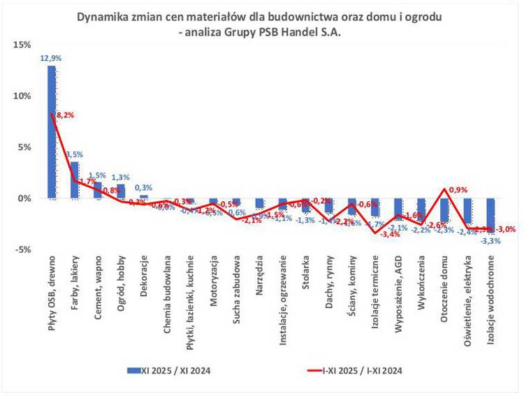 Wzrost cen w listopadzie 2025 r. w porównaniu do listopada 2024 r. odnotowano w 4 grupach towarowych, które dotyczyły kategorii: płyty OSB, drewno (+13%), farby, lakiery (+4%), cement, wapno (+2%) i ogród, hobby (+1%). Na tym samym poziomie pozostały ceny w kategoriach: dekoracje, chemia budowlana i płytki, łazienki, kuchnie. Spadek cen wystąpił w 13 podgrupach, z czego o 1% spadły ceny w kategoriach: motoryzacja, sucha zabudowa, narzędzia, oraz instalacje, ogrzewanie, stolarka oraz dachy, rynny. Dalej w kolejności uplasowały się grupy: ściany, kominy, izolacje termiczne, wyposażenie, AGD, wykończenia, otoczenie domu oraz oświetlenie, elektryka (po -2%). Najwyższą obniżkę odnotowano w kategorii: izolacje wodochronne, gdzie ceny spadły o 3%.