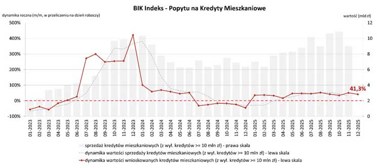 O 41,3% r/r wzrosła wartość zapytań o kredyty mieszkaniowe w grudniu 2025 r. – informuje BIK Indeks Popytu na Kredyty Mieszkaniowe. Wartość Indeksu oznacza, że w grudniu 2025 r., w przeliczeniu na dzień roboczy, banki i SKOK-i przesłały do BIK zapytania o kredyty mieszkaniowe na kwotę wyższą o 41,3% w porównaniu do grudnia 2024 r.