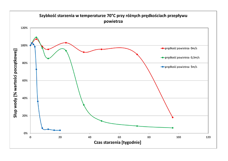Dörken, dynamika procesu starzenia w temperaturze 70°C przy zróżnicowanych prędkościach przepływu powietrza