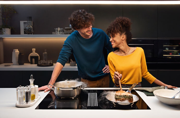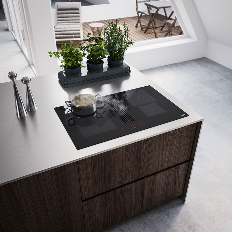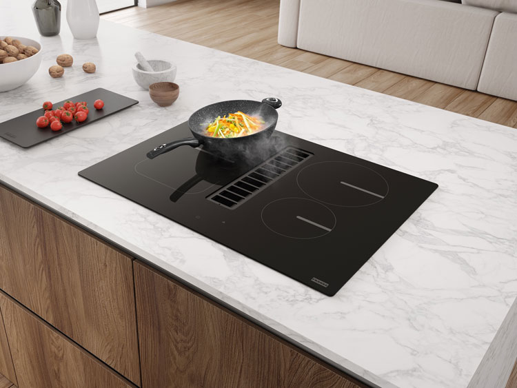 W tradycyjnej kuchni para i zapachy unoszą się do góry, a okap absorbuje je z wysokości. Przy płycie ze zintegrowanym wyciągiem zasysanie odbywa się tuż obok źródła pary. W praktyce oznacza to, że część zanieczyszczeń jest przechwytywana szybciej, a powietrze w kuchni ma szansę pozostać świeższe, szczególnie gdy gotujesz intensywnie lub masz kuchnię połączoną z salonem. Co ważne, okap uruchamia się automatycznie wraz z płytą i dostosowuje moc do intensywności gotowania.