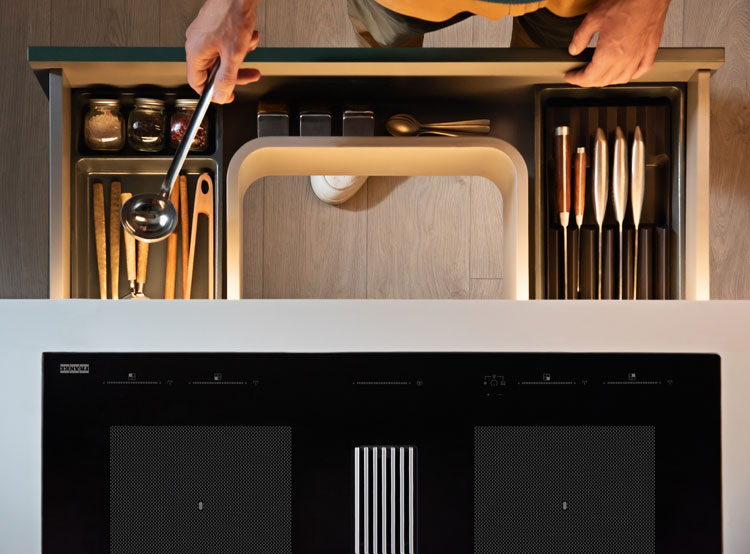 Po drugie, miejsce pod blatem i sam blat. Urządzenie ma określone wymagania montażowe, dlatego przed wyborem warto sprawdzić wymiary oraz kompatybilność z zabudową. To szczególnie istotne, jeśli planujemy szuflady pod płytą. W przypadku płyt Franke z serii 2gether pod urządzeniem może znaleźć się szuflada w kształcie litery U, wygodna na sztućce. Trzeba też pamiętać o wymaganiach dotyczących blatu. Powinien być odpowiednio wytrzymały, dlatego wybór najlepiej uzgodnić ze studiem kuchennym lub kamieniarzem, szczególnie gdy planujemy montaż płyty na równi z blatem.
