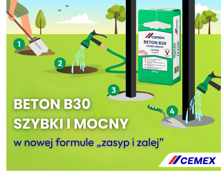 „Beton B30 Szybki i mocny” z oferty Cemex Polska jest już dostępny w nowej odsłonie. Produkt oznaczony jako CX-P230 może być od teraz stosowany także w formule „zasyp i zalej”, bez konieczności uprzedniego mieszania. Uproszczona metoda aplikacji znajduje zastosowanie przede wszystkim przy pracach ogrodowych i montażowych.