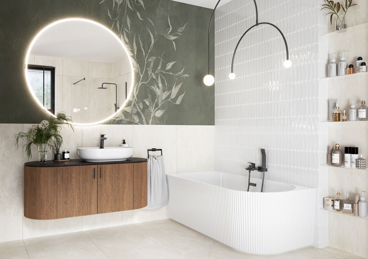 VITTO GUN METAL VERDELINE odpowiada na potrzeby inwestorów poszukujących mocniejszego akcentu kolorystycznego. Metaliczno-grafitowe wykończenie gun metal, uzyskane w technologii PVD, jest trwałe i odporne na zarysowania, a przy tym łatwe w pielęgnacji. Aranżacja oparta na kaflach o subtelnej teksturze zyskuje głębię dzięki zielonej ścianie z roślinnym motywem. Obłe formy łagodzą kompozycję, w której baterie o wyważonej geometrii stają się kluczowymi elementami.