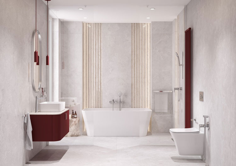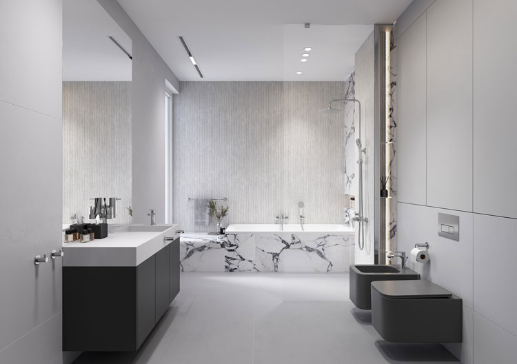 TALASSA wyróżnia się ultracienką, płaską wylewką, która koresponduje z linią uchwytu. Smukłe korpusy i opływowe krawędzie nadają armaturze subtelność, a połysk chromu podkreśla jej uniwersalność. W aranżacji utrzymanej w chłodnych bielach i szarościach oś widokową zamyka wanna z marmurową obudową. Po lewej stronie szeroki blat z umywalką współgra ze stojącą baterią, a po prawej analogiczna strefa sanitarna z czarnym bidetem i WC zachowuje wizualną równowagę. Akcesoria SMILE BA to jednolity system wyposażenia, którego lśniące powierzchnie odbijają światło, wzmacniając wrażenie czystości i precyzji wykonania.