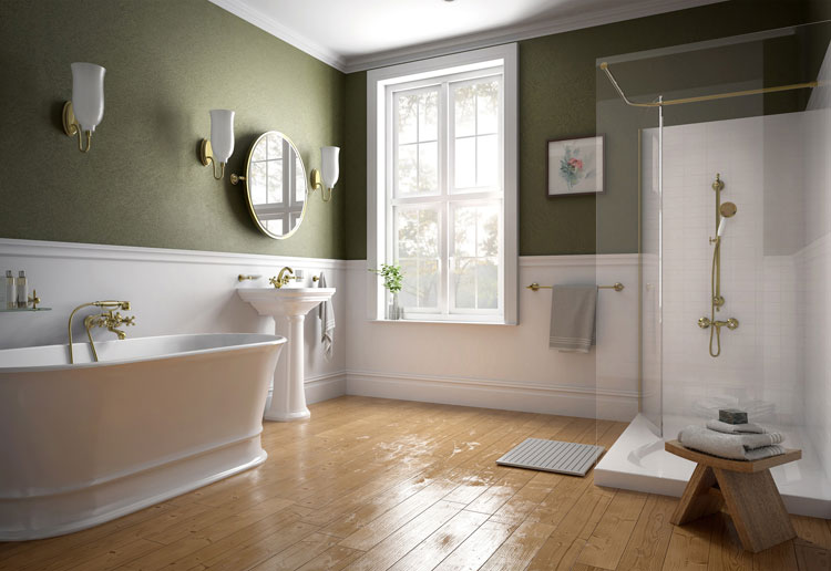 ANTICA to propozycja dla miłośników klasycznej stylistyki. Wykończenie w kolorze starego brązu, krzyżowe uchwyty oraz finezyjne, opływowe linie przywołują ducha dawnych epok. W salonie kąpielowym oliwkowe ściany zestawione z białą boazerią i ciepłym parkietem tworzą szlachetne tło dla armatury. Bateria z misternie dopracowanymi detalami podkreśla charakter umywalki na postumencie, a ścienny model natryskowy RETRO z rączką stylizowaną na telefoniczną słuchawkę stanowi ozdobę kabiny z brodzikiem.