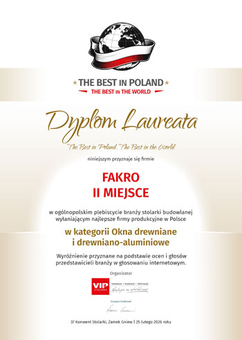 W branżowym głosowaniu internetowym, w którym to specjaliści - producenci i dostawcy - decydują o najlepszych produktach na rynku, nasze rozwiązania zdobyły wyjątkowe uznanie. Podczas ostatniego Kowentu Stolarka VIP, w programie „The Best in Poland – The Best in the World”, otrzymaliśmy: I miejsce w kategorii Okna dachowe oraz II miejsce w kategorii Okna drewniane i drewniano-aluminiowe, w której nagrodzono linię stolarki pionowej FAKRO INNOVIEW.