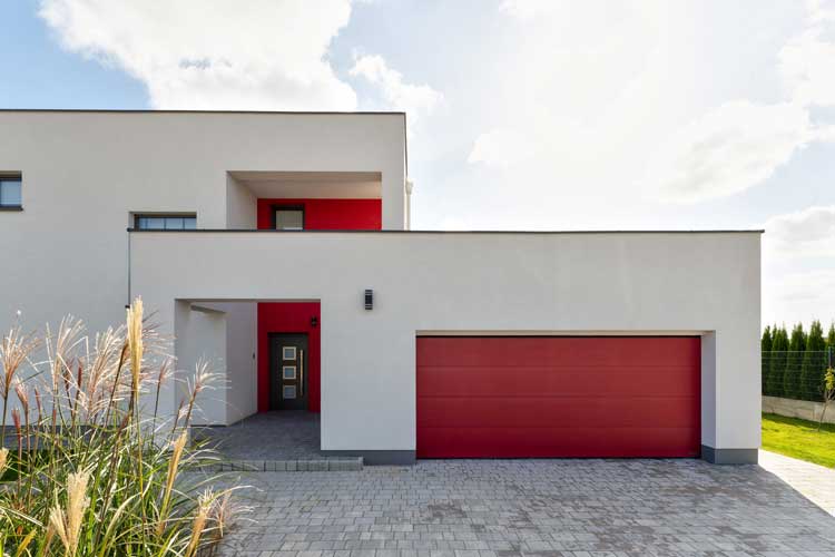 Kiedy architektura idzie w minimalizm to brama garażowa jest motywem, który pozwala się wyróżnić. Tak jak ta dwustanowiskowa brama UniTherm w kolorze HI Flame Red.