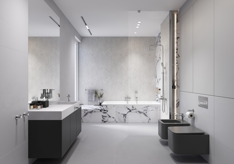 Kolekcja TALASSA posiada płaskie wylewki i chromowane wykończenie, które odbija światło, tworząc refleksy ożywiające otoczenie. W szarościach i bieli pojawiają się akcenty czerni oraz eleganckie tekstury marmuru. Naprzeciwko grafitowej szafki umywalkowej umieszczono analogicznie wykończoną ciemną ceramikę o masywnych, geometrycznych kształtach. Zestawienie z błyszczącą, stojącą baterią bidetową tworzy wyważony kontrast, podkreślając znaczenie detalu.