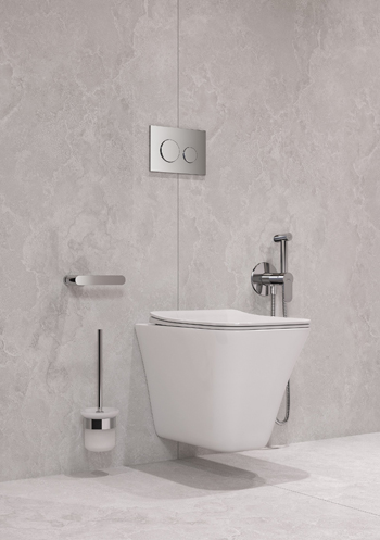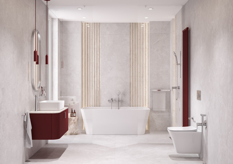 Koncepcja „quiet luxury” towarzysząca serii NOSTRIS oparta jest na dyskretnej elegancji i wysokiej jakości wykonania. Jasne powierzchnie o delikatnym rysunku kamienia, symetryczny układ pionowego ryflowania oraz bordowe detale budują interesującą, reprezentacyjną przestrzeń. Armatura o przemyślanych proporcjach i lustrzanym wykończeniu wprowadza lekkość i podkreśla czystość kompozycji. Smukła toaleta z podtynkową baterią bidetową o zaokrąglonych krawędziach pozostaje niemal niewidoczna, wtapiając się w ścienne tło. Uzupełniające akcesoria z tej samej linii, rozmieszczone zgodnie z zasadami ergonomii, nie zakłócają estetyki.