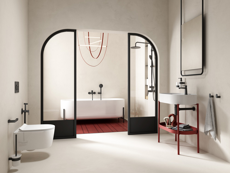 Zupełnie inny klimat prezentuje przestrzeń z kolekcją NOSTRIS. Tu dominują kontrasty – jasna baza w odcieniach kości słoniowej zestawiona została z czarną, matową armaturą. Intensywna, czerwona posadzka w strefie kąpielowej tworzy wyraźną granicę, podkreśloną przez łukowe przejście prowadzące do oryginalnej wanny na nóżkach oraz otwartego natrysku. Płaski uchwyt stanowi znak charakterystyczny serii, a mocowanie podtynkowe baterii bidetowej umożliwia schowanie mechanizmu sterującego w ścianie, co ułatwia utrzymanie czystości. Zlokalizowana po drugiej stronie szczotka do WC i uchwyt na papier dopełniają tę część pomieszczenia ergonomicznie i wizualnie.