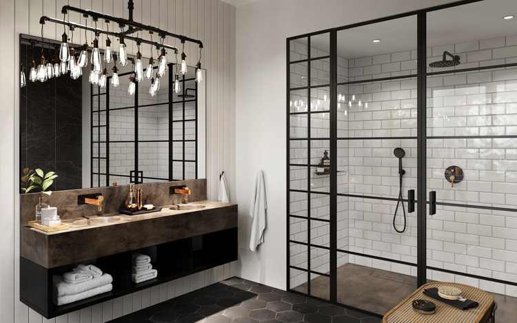 W loftowym stylu czerń pełni rolę wyrazistego akcentu. Metalowe ramy drzwi wydzielają obszerny prysznic, podkreślając industrialny klimat. Ich geometryczna forma wprowadza surowość, ale jednocześnie porządkuje aranżację. Podtynkowy zestaw natryskowy ZAFFIRO z okrągłą deszczownią, trzyfunkcyjną rączką oraz baterią wyposażoną w poręczny uchwyt i przełącznik sterujący z różowego złota stanowi swoistą biżuterię. Specyficzny żyrandol z rurami hydraulicznymi i żarówkami edisonkami rozświetla wiszącą szafkę z surowym blatem ze szczotkowanego metalu. Podtynkowe baterie umywalkowe są zaopatrzone w mechanizm podtynkowy i elementy natynkowe jak matowe maskownice, połyskujące wylewki o optymalnym zasięgu i ergonomiczne uchwyty. Ich proste, minimalistyczne wzornictwo, oparte na harmonii prostokątów i owali, świetnie wpisuje się w aktualne trendy.