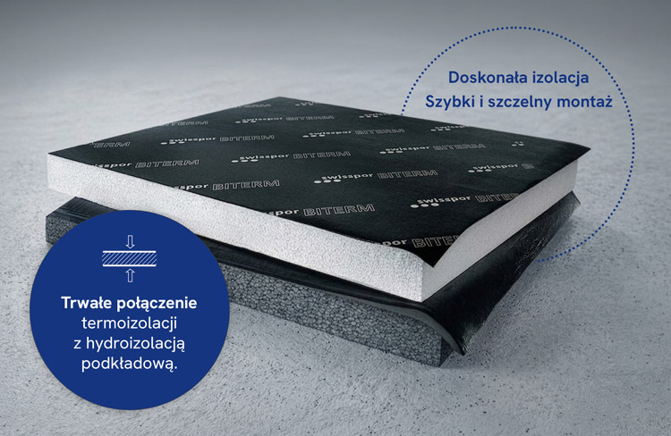 swisspor BITERM to warstwowe płyty izolacyjne – potocznie zwane „styropapa” – składające się z rdzenia ze styropianu trwale połączonego z warstwą termozgrzewalnej papy asfaltowej. Rdzeń płyty wykonany jest ze styropianu o naprężeniu ściskającym przy 10% odkształceniu co najmniej 80 kPa. Okładzinę stanowi zgrzewalna, podkładowa papa asfaltowa na welonie z włókien szklanych, fabrycznie laminowana do powierzchni styropianu. Połączenie to jest odporne na rozciąganie (wytrzymałość ≥ 0,1 MPa), na działanie wody (≥ 0,1 MPa) oraz na temperatury ekstremalne: zarówno +80°C, jak i −20°C (≥ 0,1 MPa). Wytrzymałość połączenia na oddzieranie wynosi co najmniej 20 Nmm/mm. Produkt posiada klasyfikację ogniową BROOF(t1) i NRO.