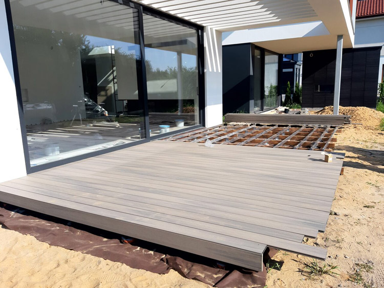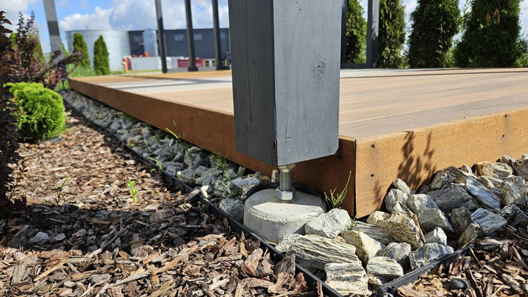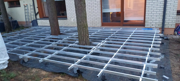 Podstawą jest stabilne podłoże. W pierwszej kolejności należy usunąć warstwę czarnoziemu. Pod konstrukcję rekomendowane jest wykonanie wylewki betonowej lub zastosowanie punktowych podpór, np. betonowych słupków z regulowaną kotwą (dostępne w JAF Polska). Zastosowanie agrowłókniny ogranicza rozwój chwastów pomiędzy deskami.