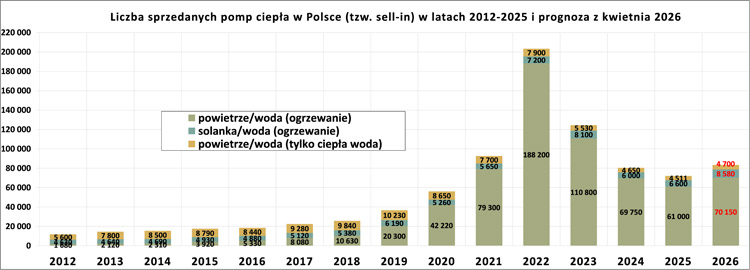 Rys. 2. Zestawienie sprzedaży (tzw. sell-in) poszczególnych typów pomp ciepła w Polsce w latach 2012-2025 i prognoza na 2026 rok. Źródło: PORT PC